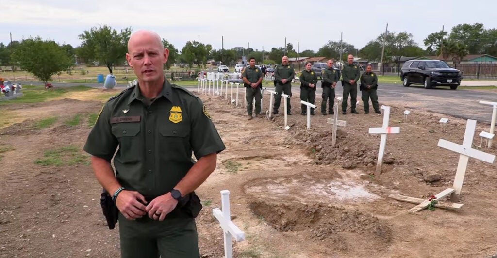 Rows of unmarked graves are visible behind Chief Border Patrol Agent Jason Owens as he pleads with those seeking to enter America not to cross the southern border illegally.