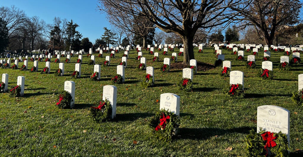It was just above freezing early Saturday when thousands of Americans arrived at Arlington National Cemetery just outside Washington, D.C. The army of volunteers bundled in their winter coats spent the morning laying about 257,000 live balsam wreaths on the white gravestones of fallen service members.