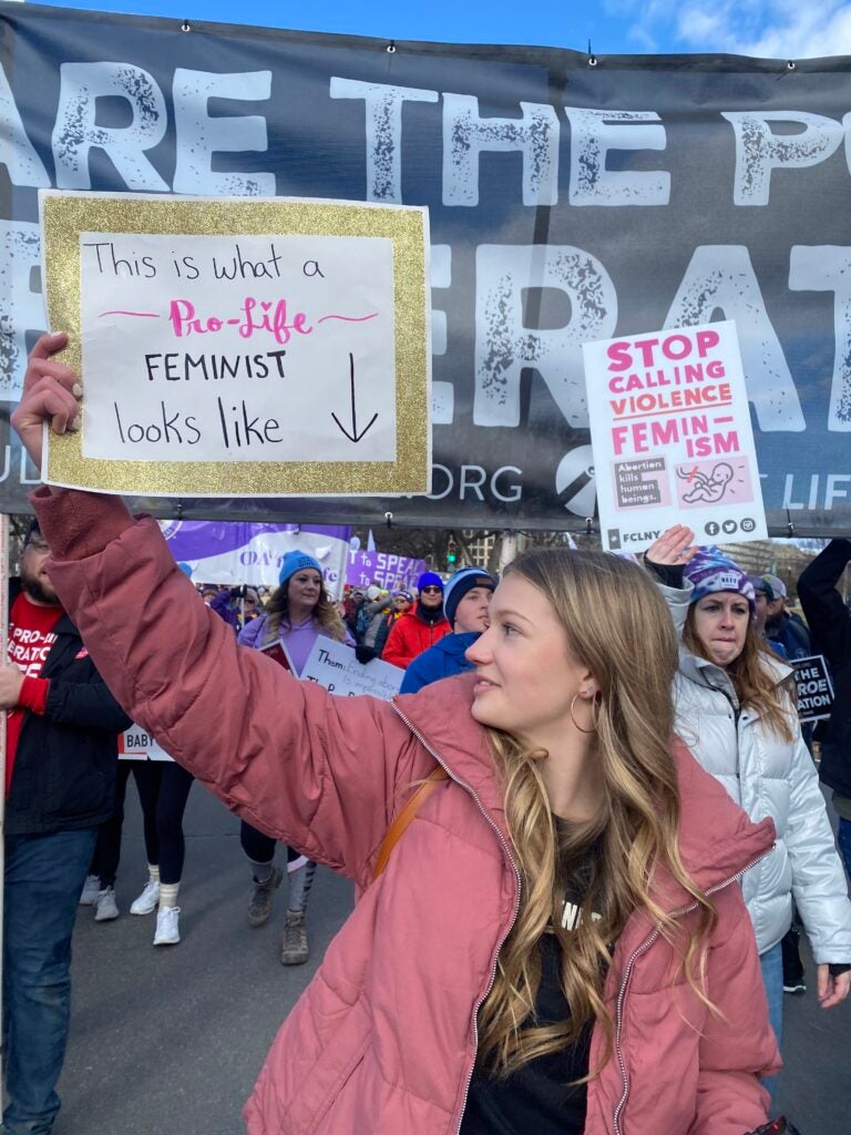 A female student holds a sign reading “This is what a pro-life feminist looks like” Jan. 20, 2023, in Washington, D.C. (Photo: Elizabeth Troutman/The Daily Signal)