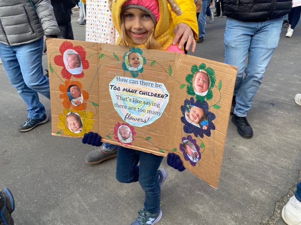 A young girl holds a homemade sign reading “How can there be too many children? That’s like saying there are too many flowers!” Jan. 20, 2023, in Washington, D.C. (Photo: Elizabeth Troutman/The Daily Signal)
