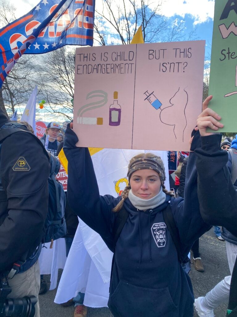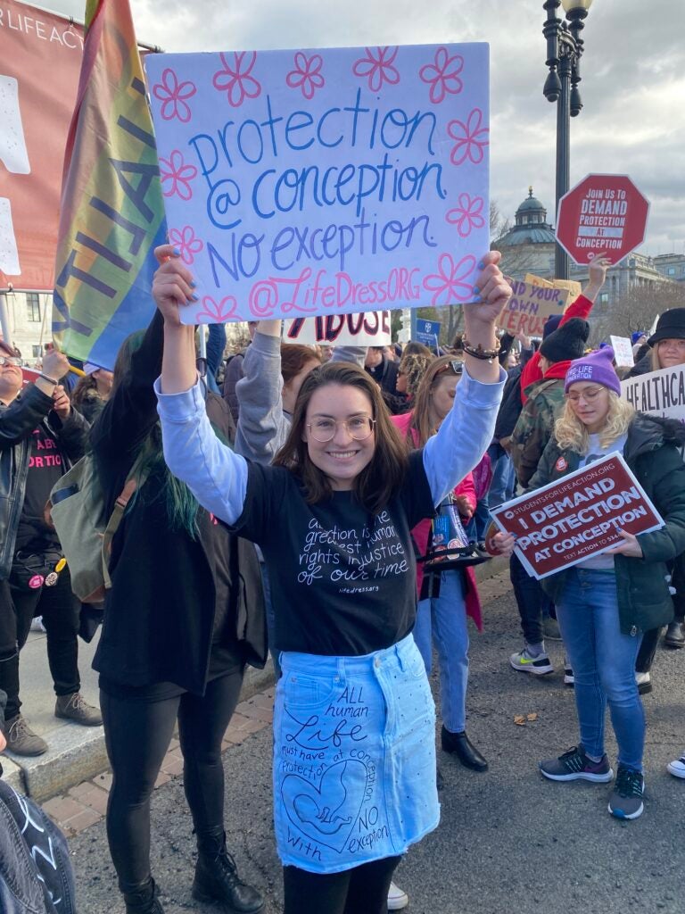 A woman dressed for the March for Life holds a sign reading “Protection @ Conception. No Exception” Jan. 20, 2023, in Washington D.C. (Photo: Elizabeth Troutman/The Daily Signal)