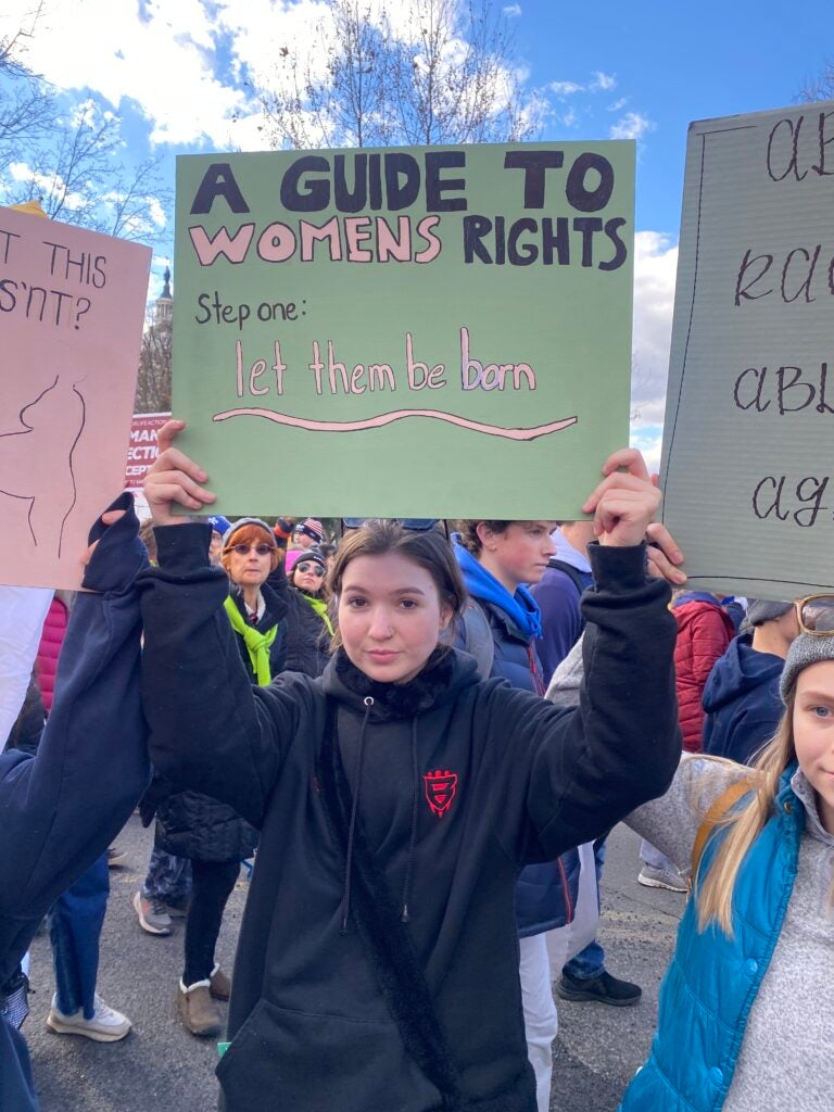 A female student holds a sign reading “A Guide to Women’s Rights: Let Them Be Born” Jan. 20, 2023, in Washington, D.C. (Photo: Elizabeth Troutman/The Daily Signal)