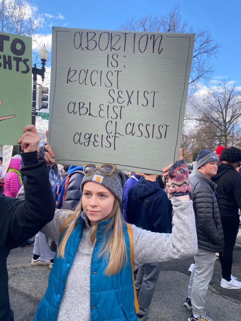 A woman holds a sign reading “Abortion Is: Racist, Sexist, Ableist, Classist, Ageist” Jan. 20, 2023, in Washington, D.C. (Photo: Elizabeth Troutman/The Daily Signal)