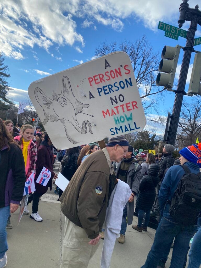 A man holds a sign reading “A Person’s A Person, No Matter How Small” in Dr. Seuss style Jan. 20, 2023, in Washington, D.C. (Photo: Elizabeth Troutman/The Daily Signal)