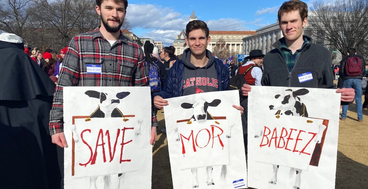 Students hold signs reading “SAVE MOR BABEEZ” in Chick-fil-A style Jan. 20, 2023, in Washington, D.C. (Photo: Michael Ippolito/The Daily Signal)