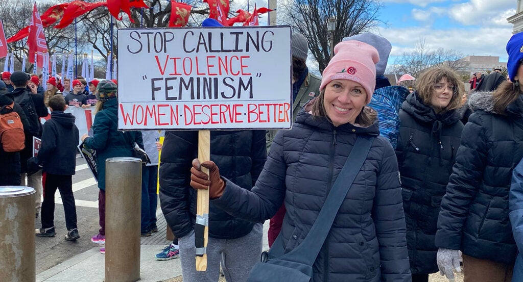Woman holds a sign reading “Stop calling violence ‘feminism.’ Women deserve better” Jan. 20, 2023, in Washington, D.C. (Photo: Samantha Aschieris/The Daily Signal)