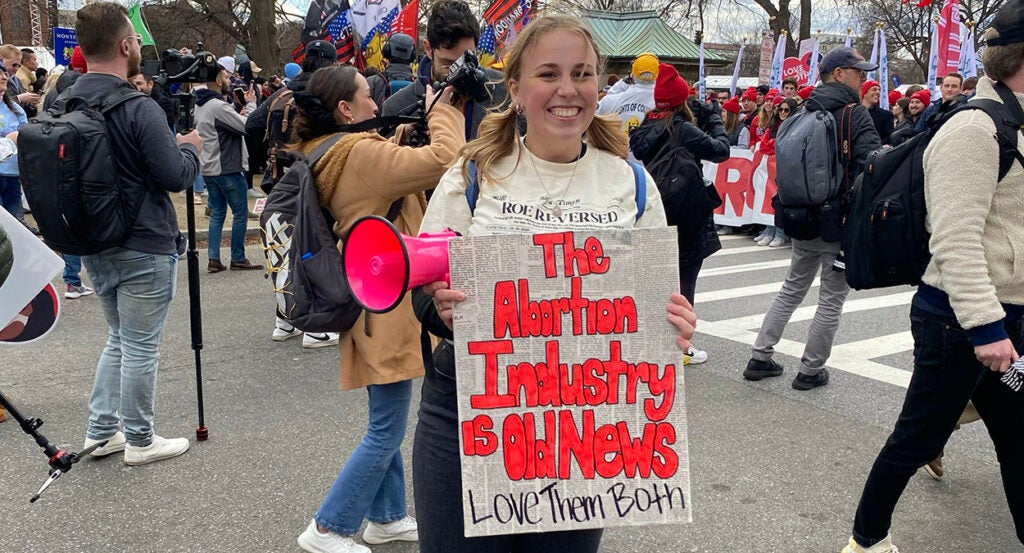 Woman holds a sign reading “The Abortion Industry Is Old News. Love Them Both” and wearing a T-shirt with the headline “Roe Reversed” Jan. 20, 2023, in Washington, D.C. (Photo: Samantha Aschieris/The Daily Signal)