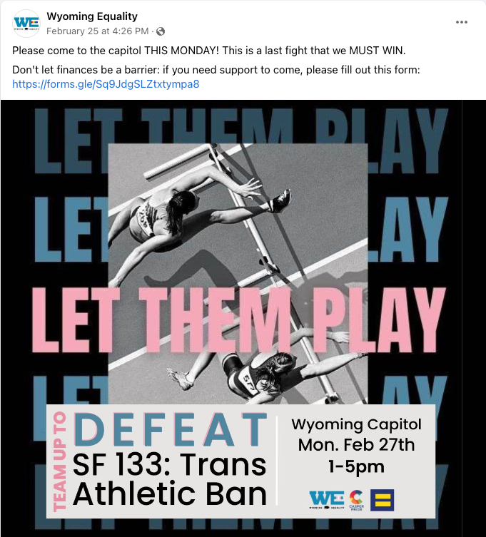 In a Facebook post, Wyoming Equality offered financial support, including for food, housing, and gas, for those interested in attending the group’s “Let Them Play” rally.