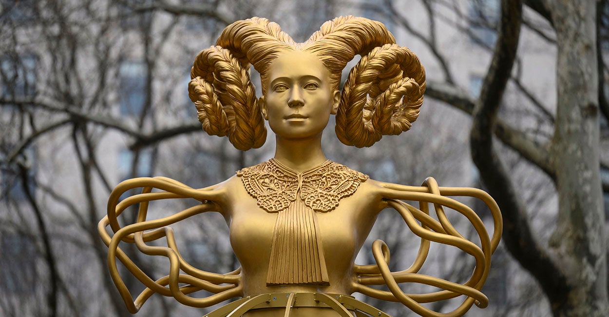 New York City’s faux pas arrived on top of the New York Supreme Court building in the form of a golden female figure emerging from a lotus with stylized tendrils in lieu of limbs. Standing alongside stone lawgivers of the past such as Moses and Justinian, “NOW” (as the piece is called) is meant to serve as an affront to the all-male cohort lining the Manhattan courthouse’s roof and to protest the U.S. Supreme Court’s reversal of Roe v. Wade.