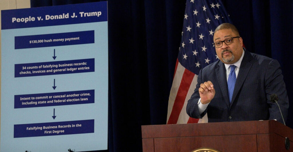 Bragg accuses Trump of reimbursing his then-attorney Michael Cohen for paying porn star Stormy Daniels $130,000 in hush money to conceal an affair that she has claimed, and Trump denies. Her silence helped Trump become president. Bragg further contends that “each check was disguised as a payment for legal services.”