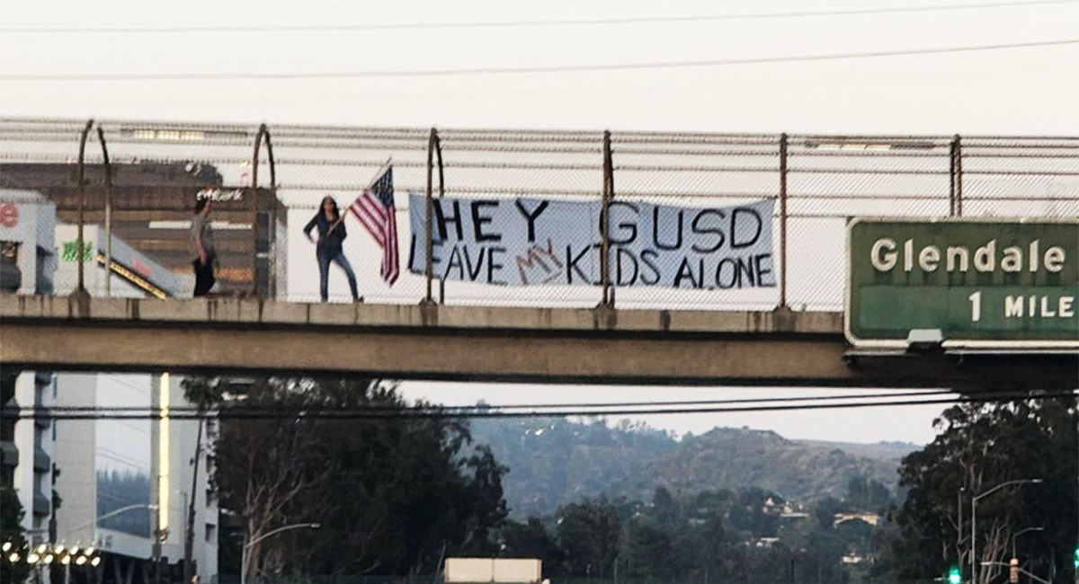Parents in the Glendale Unified School District also hung banners and signs with statements such as “Hey GUSD, Leave My Kids Alone” over freeways and outside homes in response to the elementary school’s celebration of lesbian, gay, bisexual, transgender, or “queer” individuals.