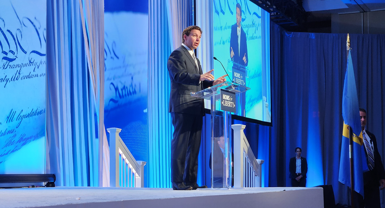 The Republican governor began his remarks by calling attention to the massive protest leading up to the Moms for Liberty summit here. The demonstrations, threats, and vandalism were something he deals with daily, DeSantis said, reassuring the crowd that it’s “a sign that we are winning this fight.”