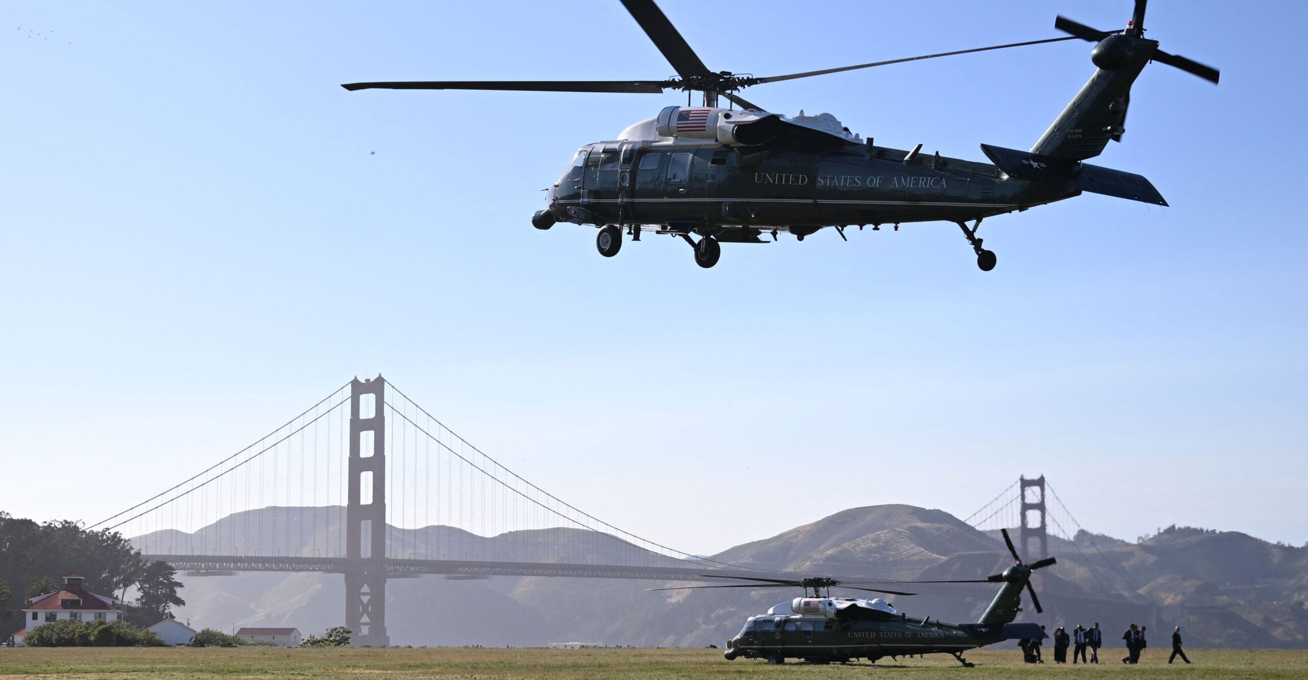 If you are Biden, you do not cross the bridge at all—and you do not take a ferry. Instead, you take a helicopter—even if you are only traveling the short distance from Crissy Field, which sits just below the bridge in San Francisco, to Mackey Field, which is about 10 miles north of the bridge at the College of Marin.
