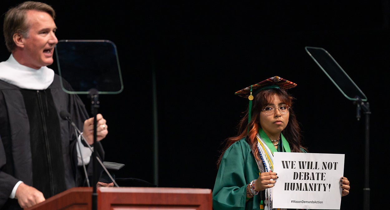 As Youngkin spoke at George Mason’s graduation ceremony in May, Galilea Sejas-Machado, a student who founded the Hispanic Latine Leadership Alliance (which appears to use “Latine” in its name and refers to Latino and Latina students as “Latinx”) and served as a student ambassador at the Center for Culture, Equity and Empowerment, held a sign reading “We Will Not Debate Humanity!”