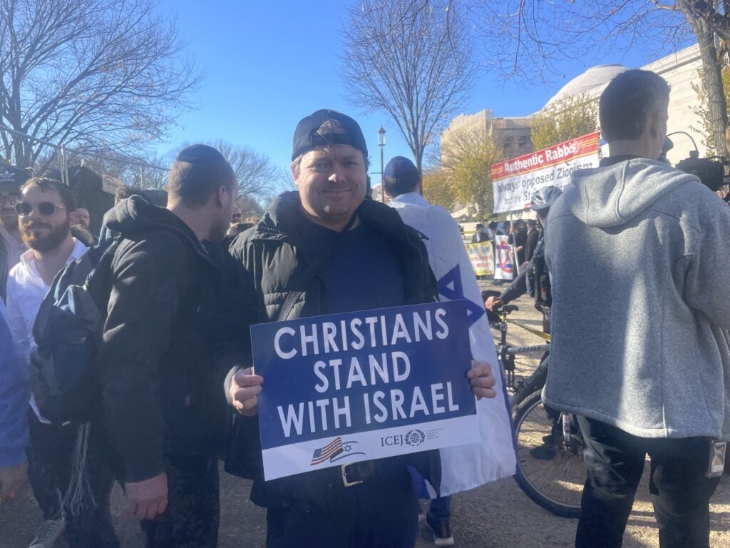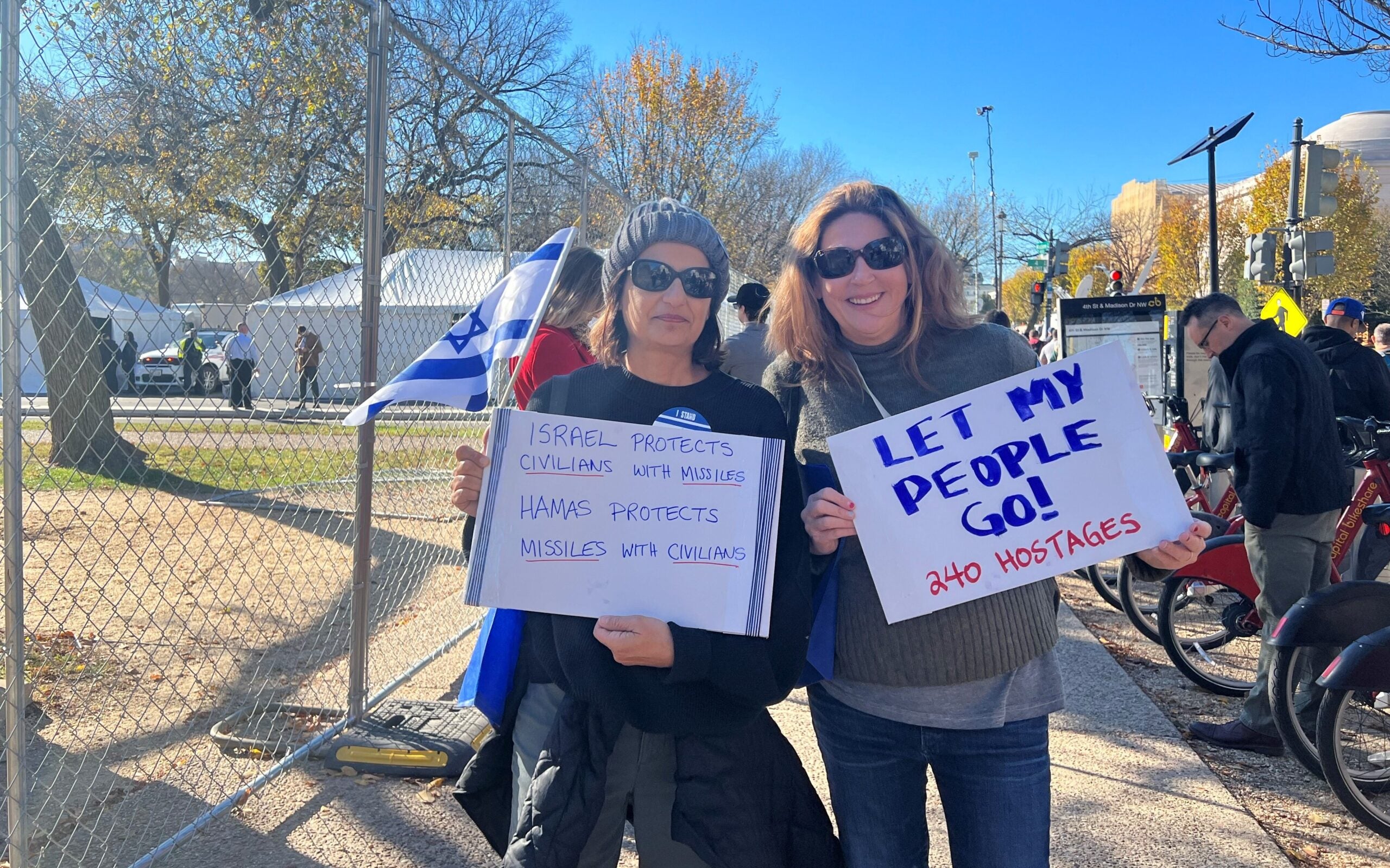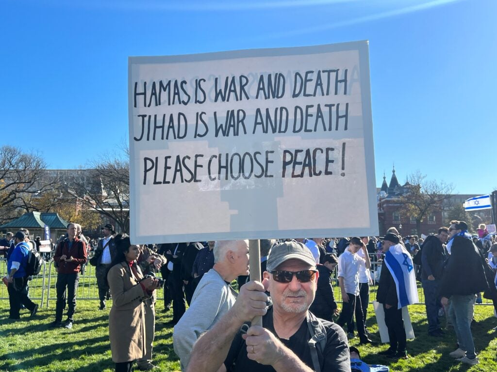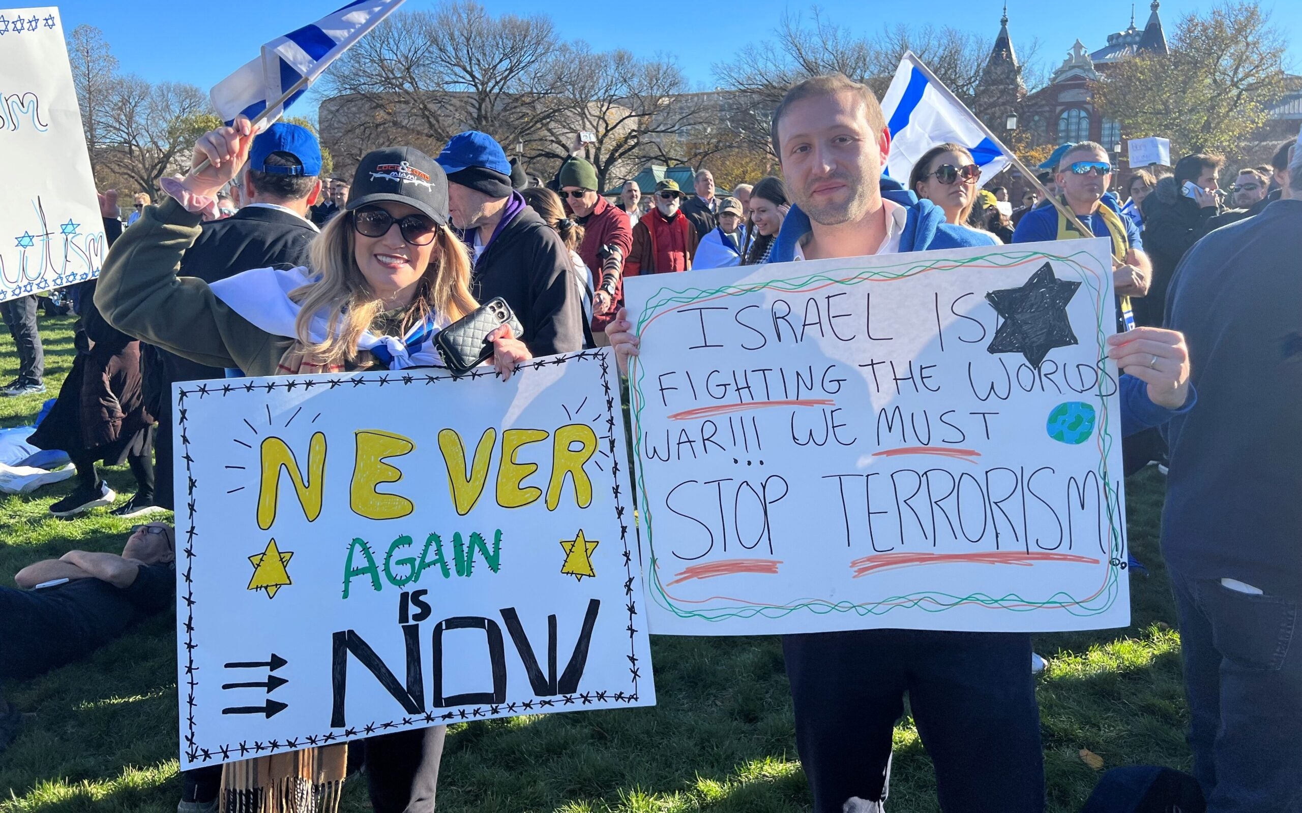 A woman holds a sign reading “Never Again Is Now,” and a man holds a sign reading “Israel Is Fighting The World’s War!!! We Must Stop Terrorism!” on Tuesday in Washington, D.C. (Photo: Sara Garstka/The Daily Signal)A woman hoists a sign reading “Didn’t we say never again?” in Washington on Tuesday. (Photo: Lucy Gilbert/The Daily Signal)Two women carry signs reading “Israel Stands With America; Does America Stand With Israel?” and “Anti-Zionism is Antisemitism” on Tuesday in Washington. (Photo: Sara Garstka/The Daily Signal)A woman displays a sign featuring a Bible verse, Luke 4:18-19, in Washington on Tuesday. (Photo: Lucy Gilbert/The Daily Signal)A man holds a sign reading “Hamas Is War And Death; Jihad Is War And Death. Please Choose Peace!” on Tuesday in Washington. (Photo: Sara Garstka/The Daily Signal)Two women carry signs reading “Israel Protects Civilians With Missiles; Hamas Protects Missiles With Civilians” and “Let My People Go! 240 Hostages” in Washington on Tuesday. (Photo: Sara Garstka/The Daily Signal)Three men display signs reading “Philly Stands With Israel”; “Empathy not enmity. One man’s independence is another man’s catastrophe”; and a third opposing antisemitism and Islamophobia and in support of Israel and Palestine, on Tuesday in Washington. (Photo: Lucy Gilbert/The Daily Signal)Two men show off signs reading “Nazis Don’t Get To Call Timeout” and “Denazify Gaza” in Washington on Tuesday. (Photo: Lucy Gilbert/The Daily Signal)A man carries a sign reading “Let my people go!” on Tuesday in Washington. (Photo: Lucy Gilbert/The Daily Signal)A man displays a sign reading “Christians Stand With Israel” in Washington on Tuesday. (Photo: Lucy Gilbert/The Daily Signal)