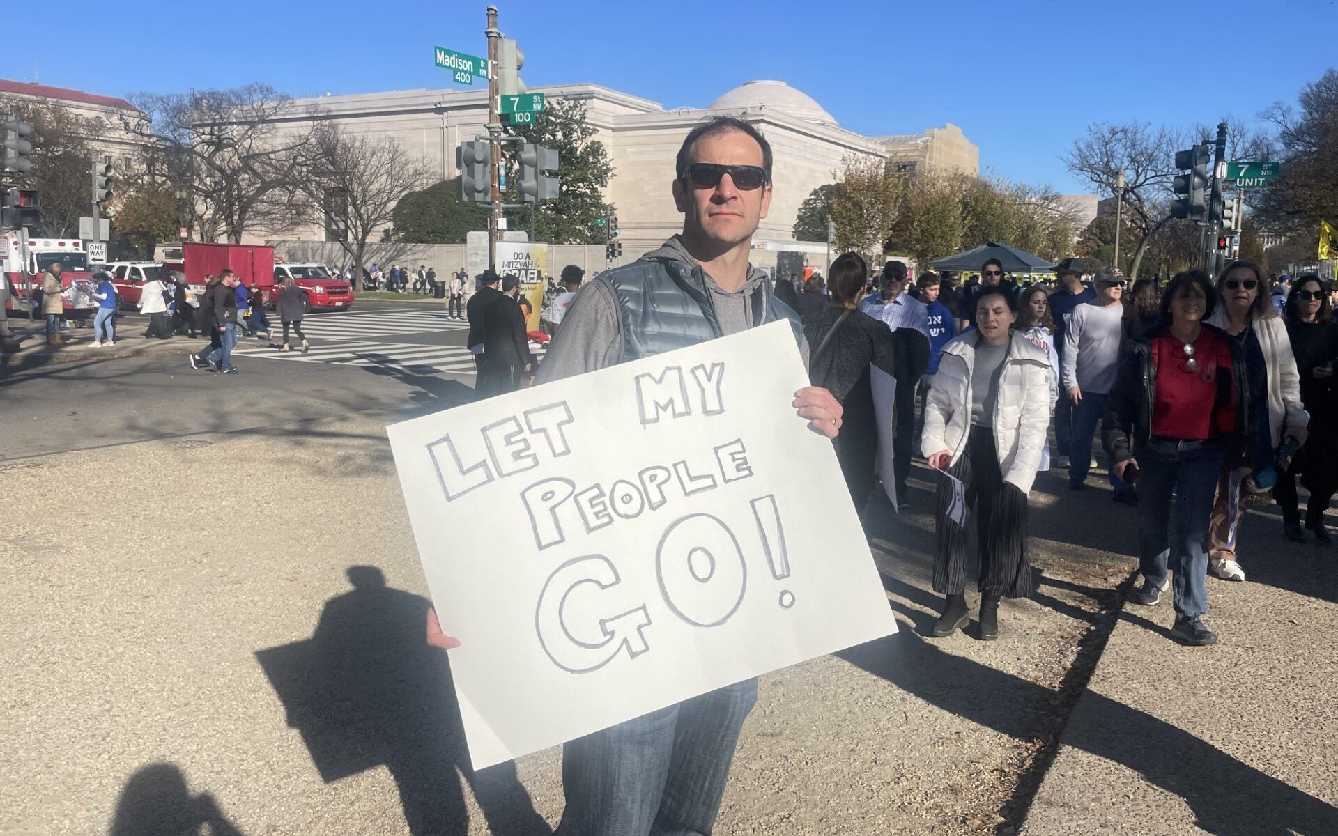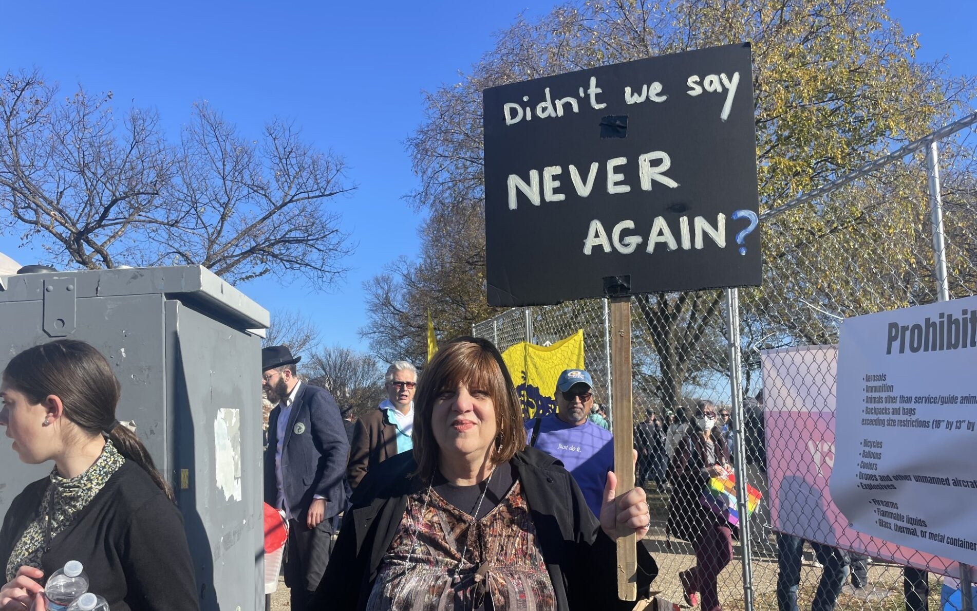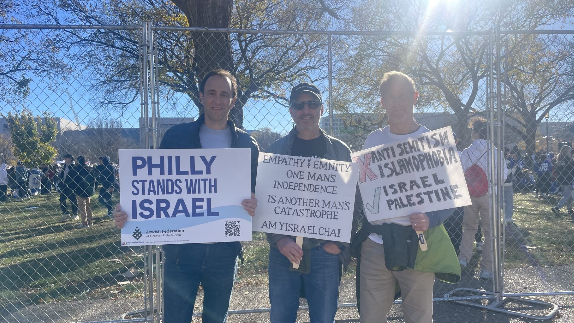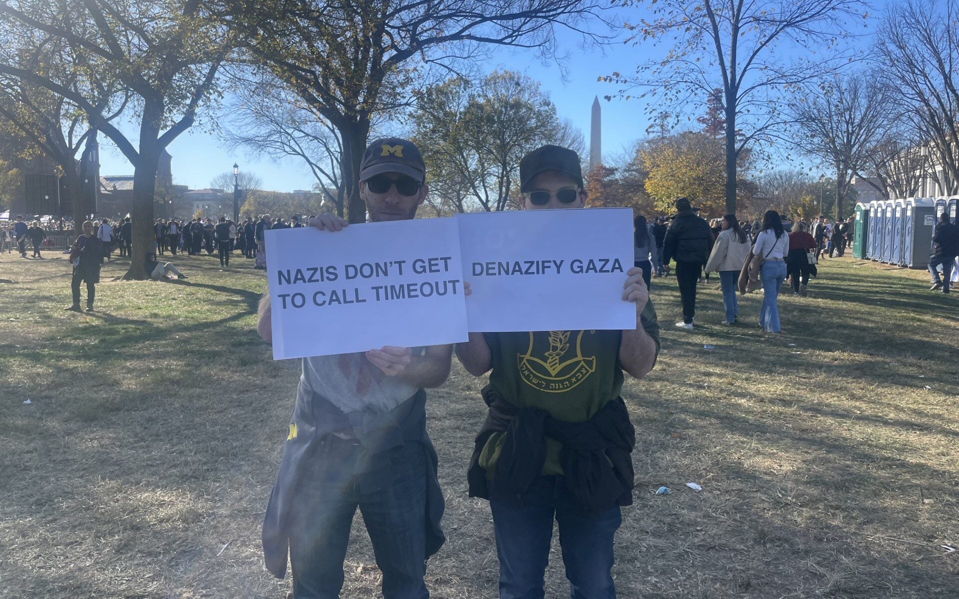 A woman holds a sign reading “Never Again Is Now,” and a man holds a sign reading “Israel Is Fighting The World’s War!!! We Must Stop Terrorism!” on Tuesday in Washington, D.C. (Photo: Sara Garstka/The Daily Signal)A woman hoists a sign reading “Didn’t we say never again?” in Washington on Tuesday. (Photo: Lucy Gilbert/The Daily Signal)Two women carry signs reading “Israel Stands With America; Does America Stand With Israel?” and “Anti-Zionism is Antisemitism” on Tuesday in Washington. (Photo: Sara Garstka/The Daily Signal)A woman displays a sign featuring a Bible verse, Luke 4:18-19, in Washington on Tuesday. (Photo: Lucy Gilbert/The Daily Signal)A man holds a sign reading “Hamas Is War And Death; Jihad Is War And Death. Please Choose Peace!” on Tuesday in Washington. (Photo: Sara Garstka/The Daily Signal)Two women carry signs reading “Israel Protects Civilians With Missiles; Hamas Protects Missiles With Civilians” and “Let My People Go! 240 Hostages” in Washington on Tuesday. (Photo: Sara Garstka/The Daily Signal)Three men display signs reading “Philly Stands With Israel”; “Empathy not enmity. One man’s independence is another man’s catastrophe”; and a third opposing antisemitism and Islamophobia and in support of Israel and Palestine, on Tuesday in Washington. (Photo: Lucy Gilbert/The Daily Signal)Two men show off signs reading “Nazis Don’t Get To Call Timeout” and “Denazify Gaza” in Washington on Tuesday. (Photo: Lucy Gilbert/The Daily Signal)A man carries a sign reading “Let my people go!” on Tuesday in Washington. (Photo: Lucy Gilbert/The Daily Signal)A man displays a sign reading “Christians Stand With Israel” in Washington on Tuesday. (Photo: Lucy Gilbert/The Daily Signal)