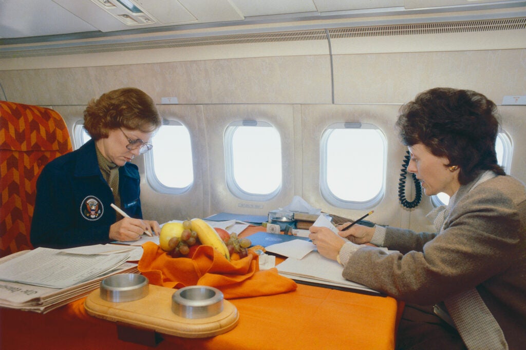 First lady Rosalynn Carter and second lady Joan Mondale work at a table on an airplane to Iowa for an appearance for their husbands’ reelection campaigns in 1980. (Photo: Diana Walker/ Getty Images).