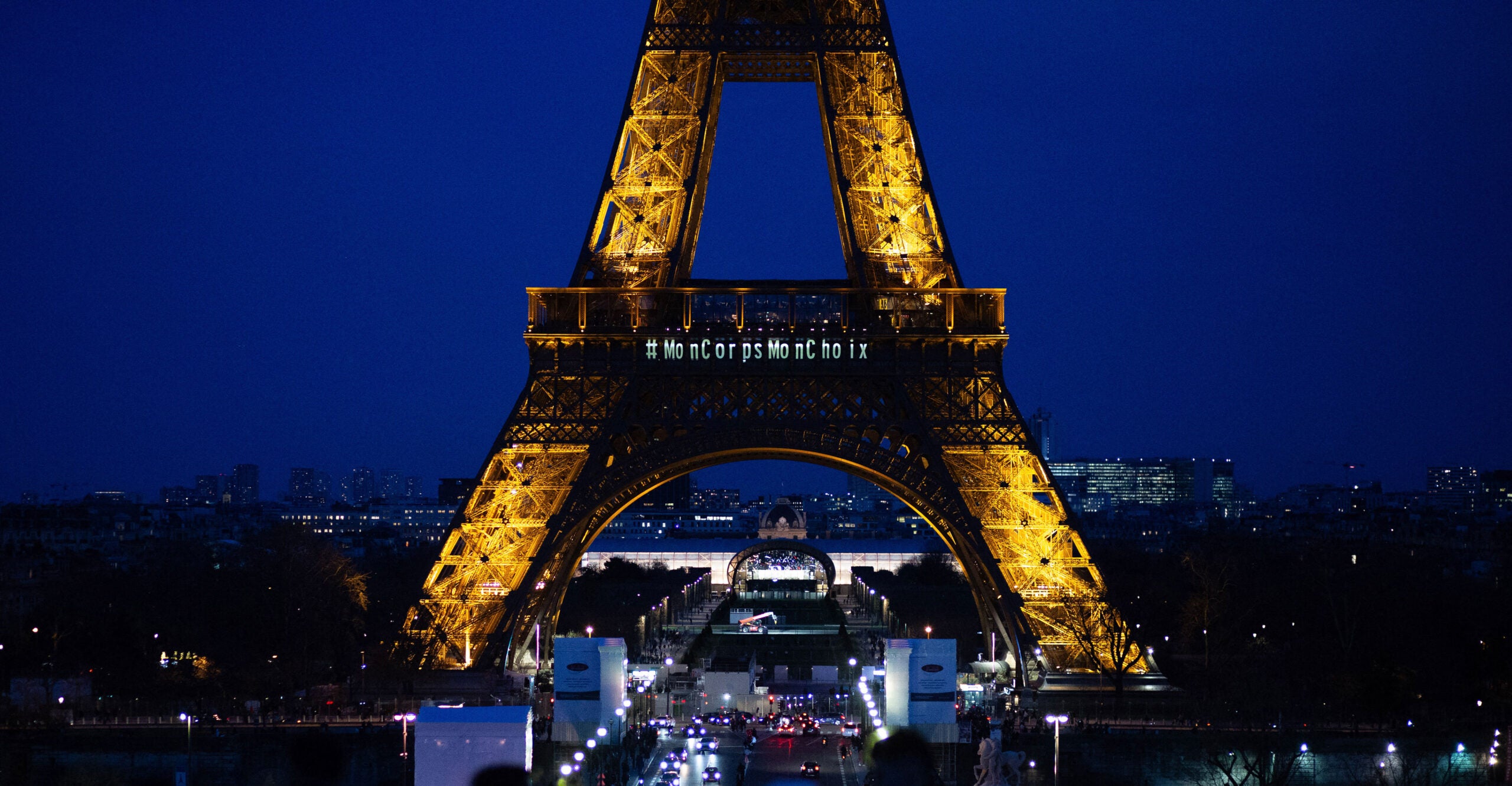 Supporters amassed in Le Parvis des Droits de l’Homme (Human Rights Square) in central Paris, singing, dancing, and waving French flags. The Eiffel Tower sparkled, with the message “#MYBODYMYCHOICE” projected onto its side.