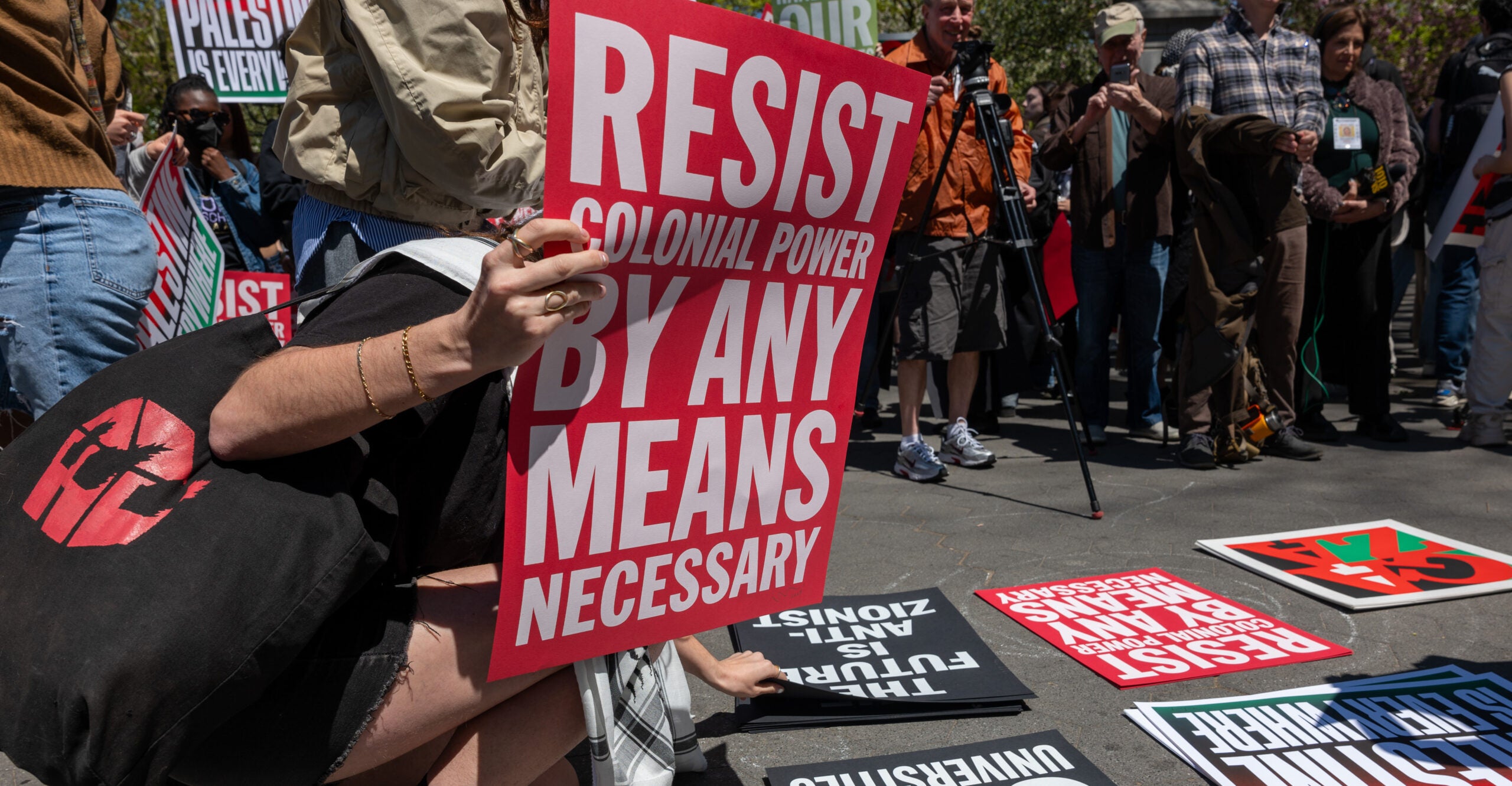 Another common refrain was that “resistance is justified,” and several signs, which appeared to be all printed together and distributed to the crowd, read “Resist colonial power by any means necessary.”