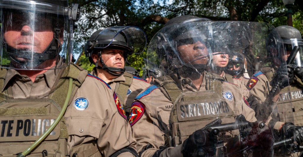 Campus police departments are usually not equipped or staffed to effectively handle a large-scale protest. So UT administrators called in the cavalry. Shortly after the students’ scheduled walk-out at 11:40 a.m., Texas Highway Patrol officers arrived to reinforce UT Campus Police (UTCP). Half an hour later, 50 more state troopers arrived with riot gear, with one reporter suggesting they arrived from Houston, 160 miles away.