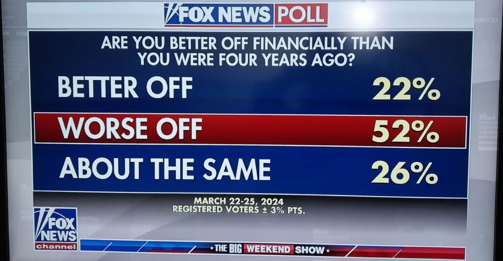 Nearly three-fifths of those polled blamed mismanagement from the Biden administration for the current poor state of the economy, and around 72% think that inflation is increasing, according to the survey.
