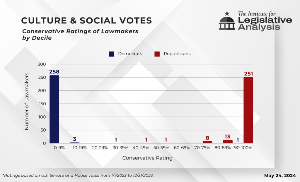 The Washington, D.C.-based Institute for Legislative Analysis made these and other discoveries after reviewing 58 Senate votes and 133 House tallies in 2023. It then rated lawmakers from zero (most liberal) to 100 (most conservative). ILA figures confirm that Capitol Hill Democrats are almost uniformly left-wing radicals while Republicans are more moderate than even GOP voters imagine.