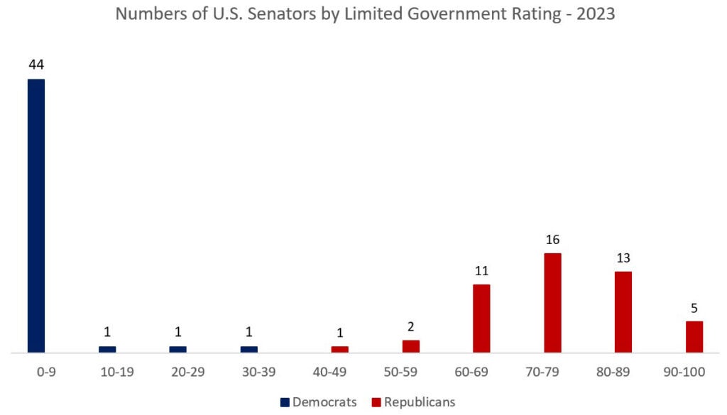 The Senate’s ideological anchors are Connecticut’s hard-Left Chris Murphy (1.79%); its most conservative Democrat, Joe Manchin of West Virginia (35.19%); the most-liberal Republican, Susan Collins of Maine (a severely centrist 50.00%); and the most-stalwart conservative, Mike Lee of Utah (100.00% pro-individual liberty, limited government, and free enterprise).