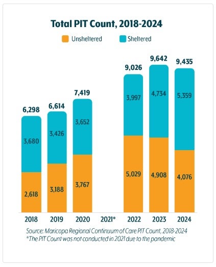 In Maricopa County, which includes Phoenix, the housed and unhoused homeless population was 6,298 in 2018 and has risen to 9,435 in 2024.