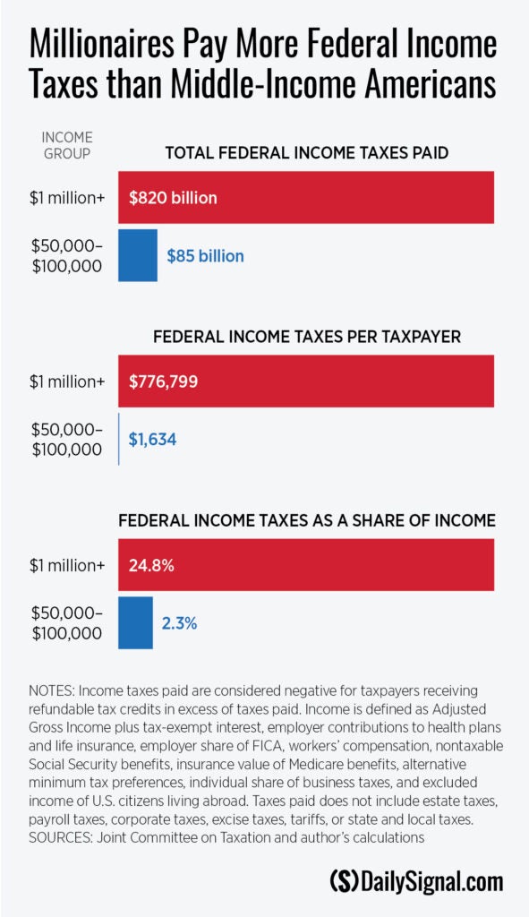 As a percentage of income, it’s somewhat more even. But still, for every dollar of income, the millionaire category will fork over more than 10 times as much in federal income taxes as their middle-income compatriots.