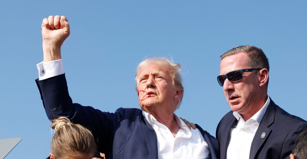 A bloodied Donald Trump pumps his fist Saturday evening as Secret Service take the former president off the rally stage following the shooting in Butler, Pennsylvania. (Photo: Anna Moneymaker/Getty Images)