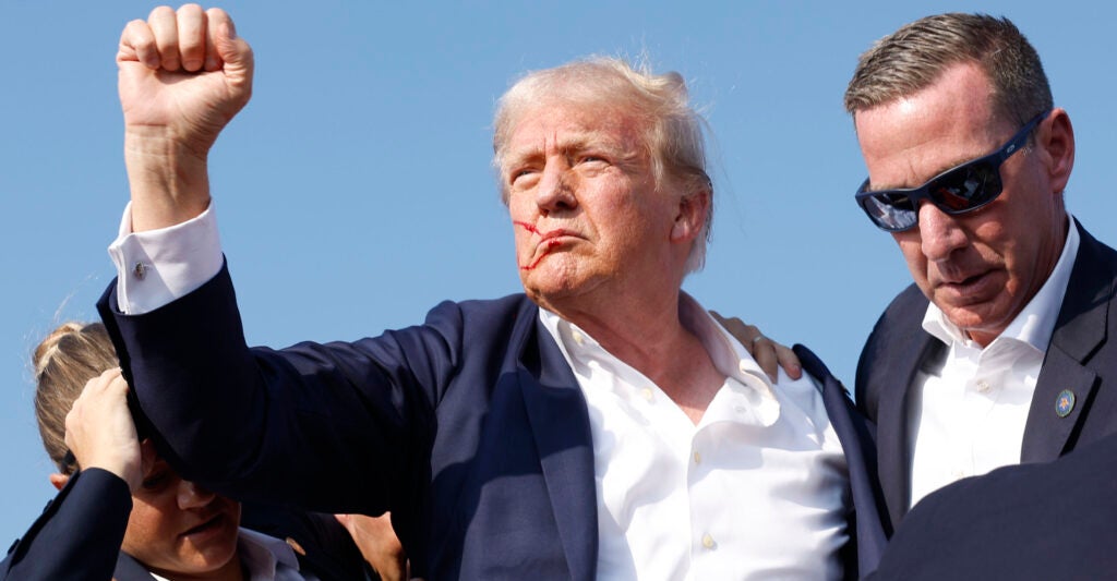 The former president shook fist pumps at the crowd as he was hustled to safety by a phalanx of Secret Service agents. He appeared to be shouting “Fight!” as he was escorted away.