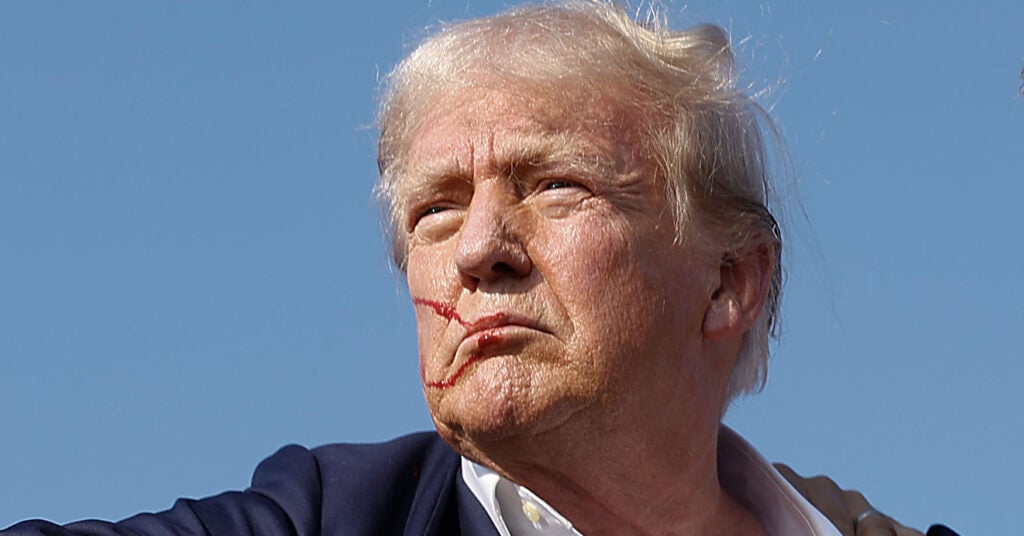 Trump’s speech began around 6 p.m. Shortly afterward, video footage shows, the former president appeared to fall to the ground, or duck below his lectern, following the sound of gunshots, and the Secret Service swarmed around him before leading him offstage and into a vehicle. Photos of the incident show a bloodied Trump defiantly raising a fist in the air.