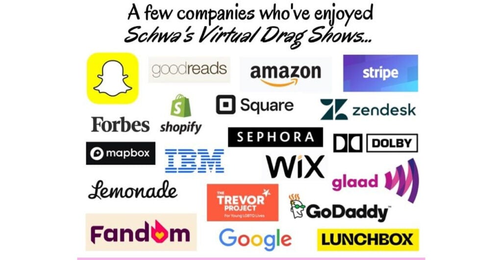 Schwa Works, the drag queen, specializes in “company-focused and corporate-friendly Zoom events.” He has hosted over 500 such virtual drag shows for companies around the world, including Amazon, Google, Snapchat, Forbes, Square Space, and Sephora, according to his website.