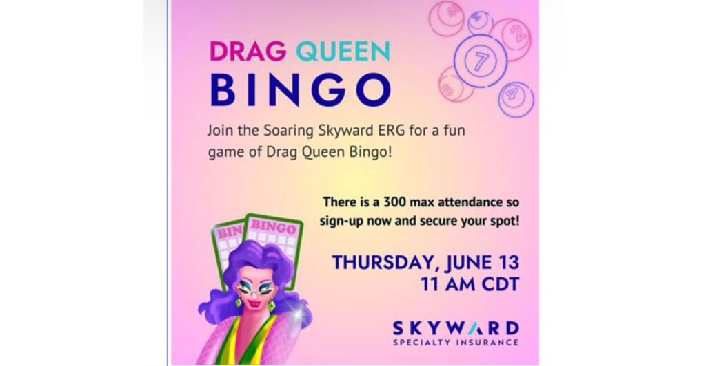 Skyward Specialty Insurance invited employees to attend a virtual bingo game at 11 a.m. on a work day, led by a man dressed in drag and using the name Schwa Works.