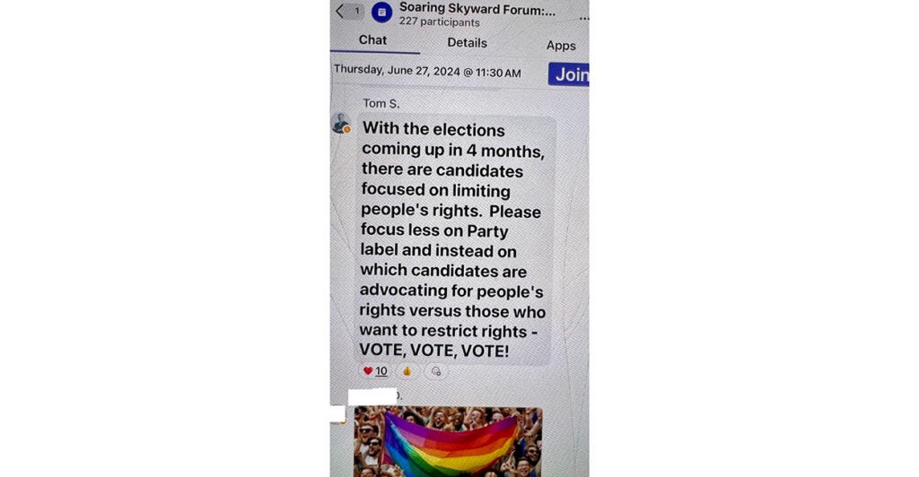 Skyward Insurance has a history of pushing a political agenda on employees. Schmitt sent a message in the LGBTQ employee resource group’s online chat at the end of June, urging employees not to vote for candidates “focused on limiting people’s rights.”
