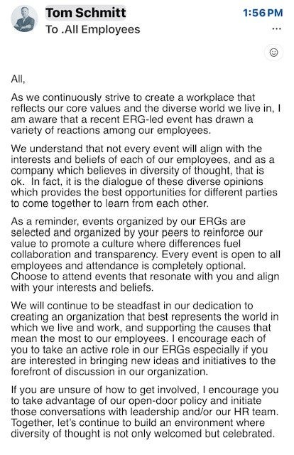 “As we continuously strive to create a workplace that reflects our core values and the diverse world we live in,” Schmitt wrote, “I am aware that a recent ERG-led event has drawn a variety of reactions [from] our employees.”