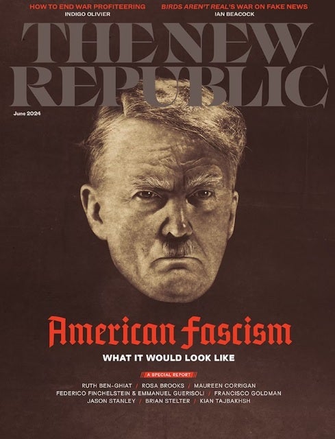 - June 2024’s cover of The New Republic featured an actual Nazi campaign poster with Hitler’s face doctored to resemble Trump. Just below, in a National Socialist typeface loomed the words “American Fascism.”