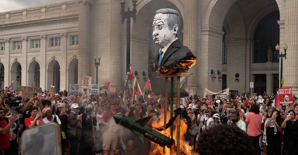 However, video from that day shows Capitol Police officers on the periphery of Columbus Circle, over 80 yards from where some anti-Israel protesters were assaulting police officers and burning U.S. flags.
