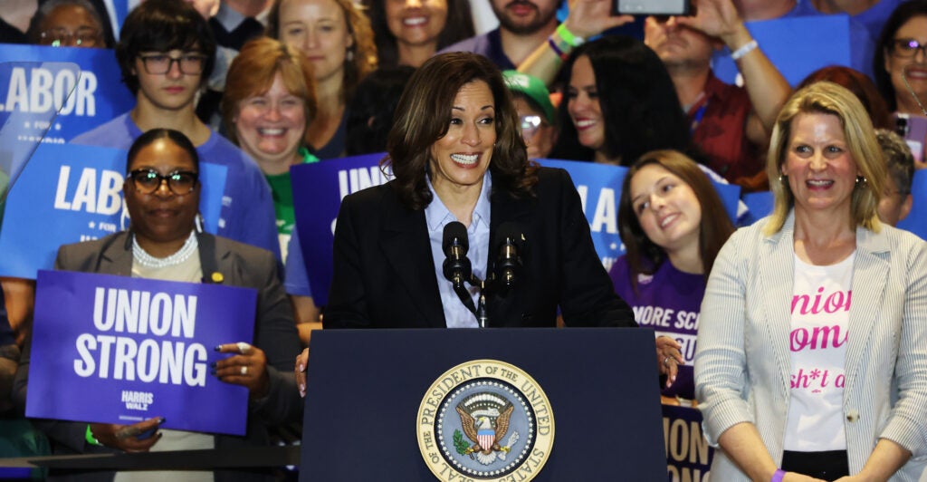 Sure, Harris says less about unions than Biden. She didn’t use the word “union” in the debate against former President Donald Trump or in her only interview since the nomination. She didn’t mention unions once in her convention speech (neither did her VP running mate Tim Walz) or in her recently released economic plan.