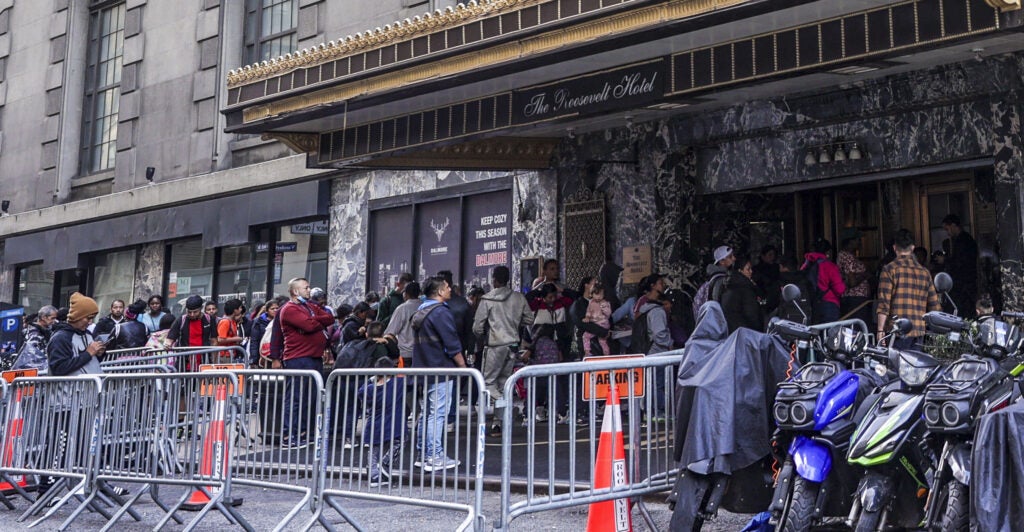 The Trump campaign is also getting backlash for posting a comparison of two images on X—one of a quiet, clean street lined with homes, and the other of hundreds of newly arrived migrants, eating and sleeping huddled on the sidewalk outside the Roosevelt Hotel in Manhattan.