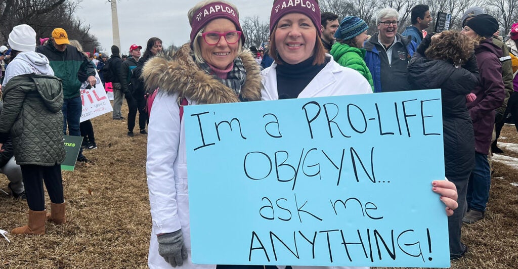 Steps from the Lincoln Memorial, Dr. Susan Bane and Dr. Christina Francis stood holding a sign reading, “I’m a pro-life OB-GYN. Ask me Anything.” Women in pink hats and holding pro-abortion signs filed by during Saturday’s Women’s March, which was rebranded to the “People’s March.”