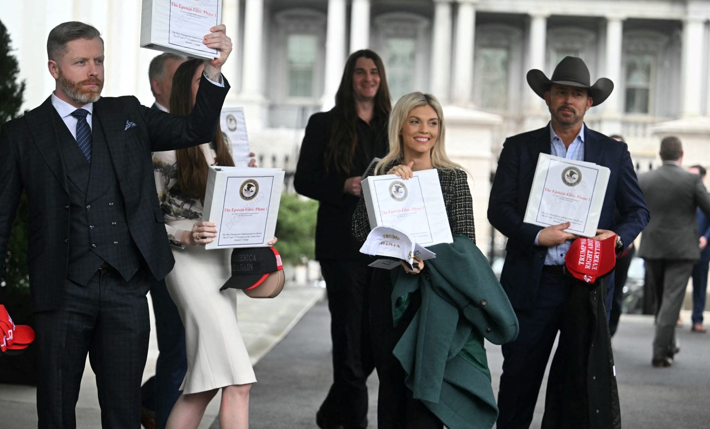 Pictures of social influencers leaving the White House midday with binders entitled “The Epstein Files: Phase 1” quickly caused confusion on social media.