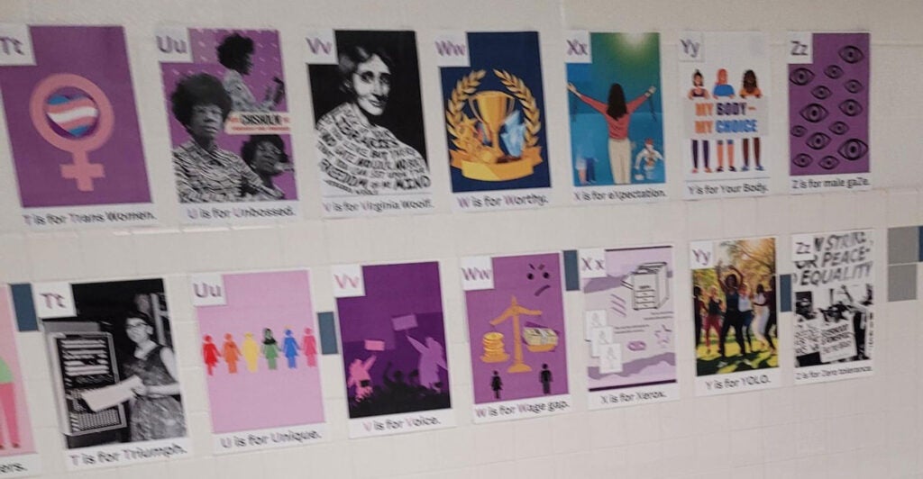 A description of the display says that it is being posted for Women’s History Month, which is March, and that “the Women’s History class in celebrating and bringing awareness to what it means to be a young woman today at West Springfield High School and in the world.”