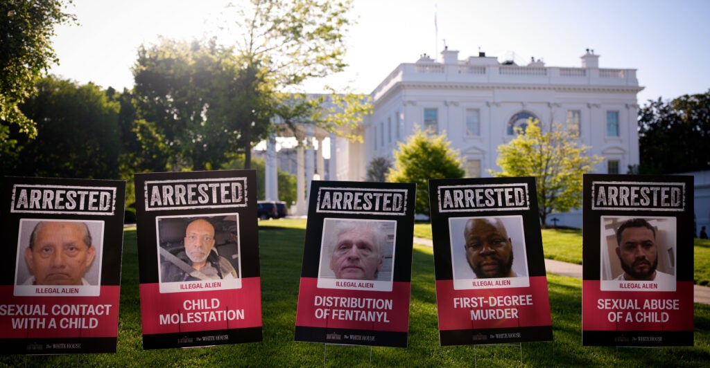 To troll the anti-Trump press, Team Trump put posters on the White House lawn—right behind the camera positions where the White House reporters chat with their anchors—with mug shots of illegal aliens who were arrested (and mostly convicted) of serious crimes, including fentanyl importation and child sexual assault.
