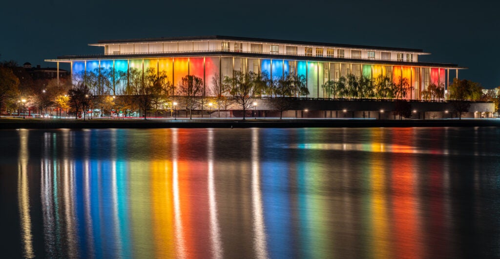 Roma Daravi, the center’s vice president of public relations, said, “The lights are a beautiful reminder of the American spirit,” adding, “The red, white, and blue colors are a powerful symbol of unity and our nation’s commitment to bringing people together. What better place for that than at the Kennedy Center, America’s institution for the arts?”