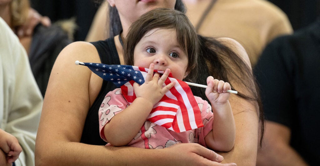 A small group of South African refugees arrived in the United States on Monday bearing American flags.