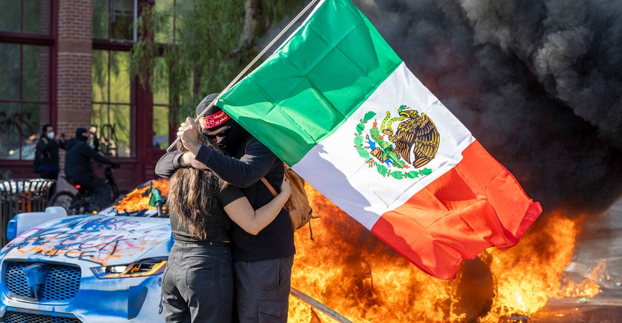 Fox News circulated a video of agitators driving motorcycles around a burning car amid the protests. One of the motorcyclists waves a Mexican flag amid the mayhem.