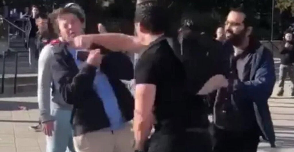 Zachary Greenberg sucker-punches Turning Point USA volunteer Hayden Williams at the University of California at Berkeley in February 2019. (Campus Reform/The Leadership Institute)