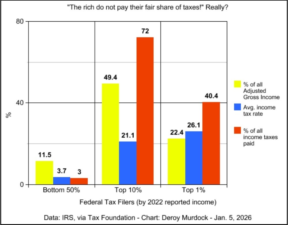 This “tax me more” phenomenon is fueled by the same ignorance that energizes Mayor Zohran Mamdani democrat-socialist, New York City; Rep. Alexandria Ocasio-Cortez, D-N.Y.; U.S. Sen. Bernie Sanders, socialist-Vt.; and other neo-Marxists. They insist that “the rich” do not pay their “fair share” of taxes.