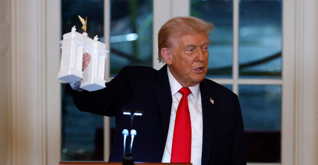 President Donald Trump holds models of an arch as he delivers remarks during a ballroom fundraising dinner on October 15, 2025 in Washington, DC. Kevin Dietsch via Getty Images